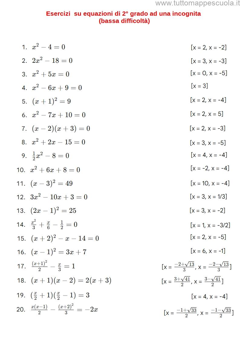 Qui di seguito una serie di esercizi sulle equazioni di secondo grado ad un’incognita. Gli esercizi sono stati divisi in base alla difficoltà (bassa, media alta) e contengono prodotti notevoli, frazioni, radicali e potenze), con soluzioni finali.